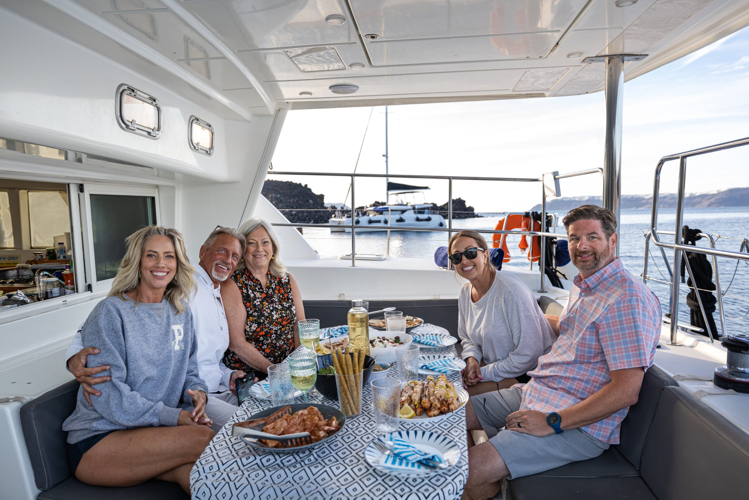 Our professional crew offers high-level service and guided tours, filled with historical and cultural insights about Santorini and its volcanic origins - Freshly Cooked Meals Onboard.