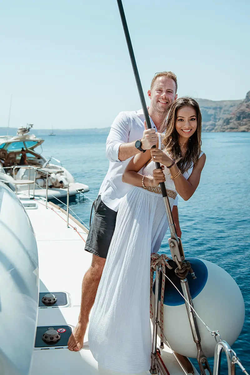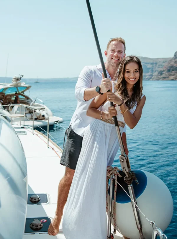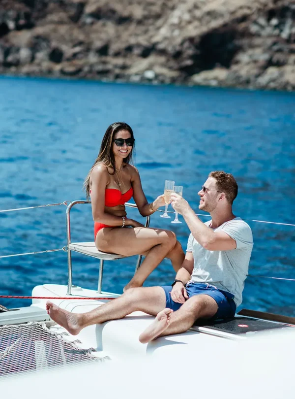 On a Luxurious Catamaran Lagoon Sailing Yacht. Join a Catamaran Sailing Tour on Santorini, It’s a Semi-private Tour which means its a shared sailing cruise on a big comfortable 44ft yacht and only 15 passengers are limited to be on board instead of the 20 that is allowed, This is so our guests will feel more than comfortable and on board and will have the luxurious and fun excursion that is expected! Make memories on board of our luxury Lagoon Sailing Yacht Catamarans while on vacation in Santorini! Visit the hottest highlights you can visit by sea and enjoy some really quality Meals & Drinks with us!